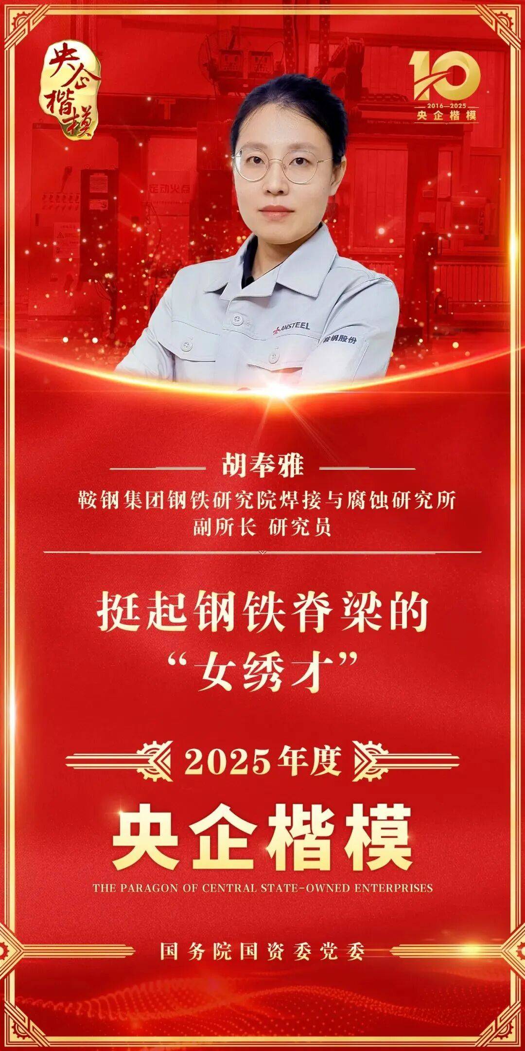 从放弃优渥待遇毅然归国,到扎根科研破解世界性难题;从精益求精打磨技术,到薪火相传培育青年力量,十年来,胡奉雅以钢材为“布”、焊枪为“针”,用创新浇灌梦想,用意志抵御风雨,用情怀诠释担当。她荣获“央企楷模”称号,实至名归,这不仅是她个人的荣誉,更是一代代鞍钢青年坚守报国初心、勇担时代使命的缩影。如今,每当夜幕降临,鞍钢的实验室里总会亮起弧光,胡奉雅和同事们依旧在挑灯夜战。时光流转,任务更迭,但“闪耀的弧光只为钢铁强国”的信念,早已深深融入她的血脉。这位新时代的“女焊将”,正以青春之我、奋斗之我,在焊接领域持续深耕,用创新精神续写传奇,用钢铁意志抵御万难,用报国情怀诠释忠诚,为实现钢铁强国梦注入源源不断的青春力量。